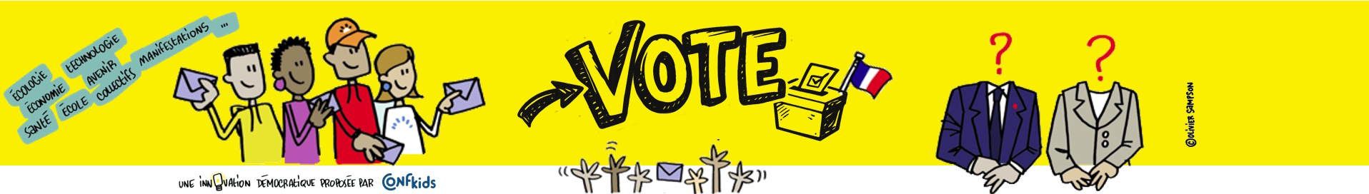 Confkids Vote est la 1ère plateforme de référendum dédiée aux citoyen.nes de 8 - 18 ans en ligne, anonyme, sécurisée, et gratuite, les invitant passer de la théorie de l'EMC à la pratique en votant sur les lois en discussion à l'assemblée, lors des élections nationales et européenne, et sur les décisions à prendre face aux défis socio environnementaux.